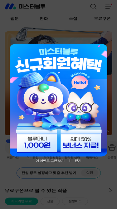 78%만화, 웹툰, 웹소설이 모두 여기에! 미스터블루에서 당신의 취향을 발견해보세요.