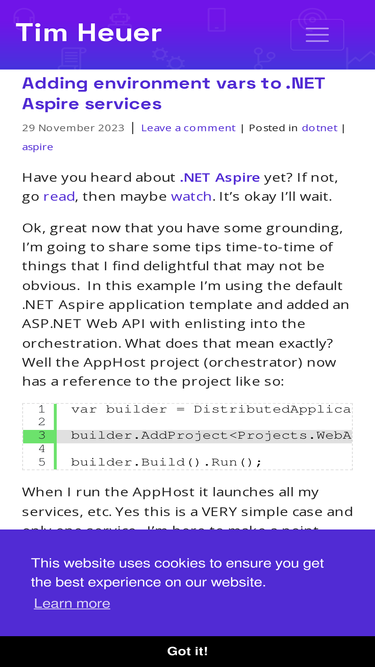 The web site and blog of Tim Heuer, Program Manager for .NET and author of Alexa.NET and Callisto (a XAML UI Toolkit). A resource to learn how to develop software with .NET technologies. This blog provides information on how to get started with .NET, ASP.NET, Blazor, and other Microsoft developer technologies.