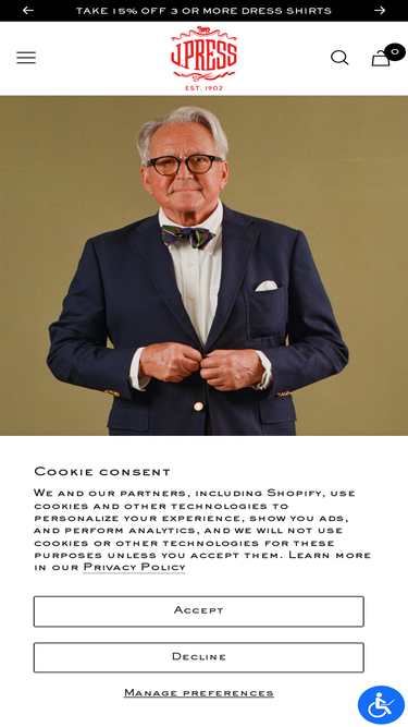 89%J. Press is synonymous with the very best of American style. Founded at Yale in 1902, J. Press is widely credited with creating "the Ivy League look" and, to this day, represents the top echelon in American tailoring and casual clothing.
