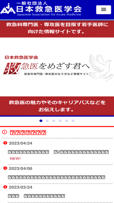 94%一般社団法人 日本救急医学会一般向けホームページです。総会・地方会案内、専門医・指導医制度について、学会誌バックナンバー、用語集、指定施設等一覧、全国救命救急センター一覧などを掲載。