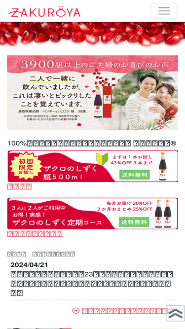 59%妊活ザクロジュース!初回送料無料。おいしい無添加・農薬不使用のザクロエキス!ザクロ100%!めでたい妊活卒業生は3,900名以上。ザクロ発祥の地のイランにこだわり、イラン産ざくろの中から厳選した栄養豊富な完熟ざくろのみを使用