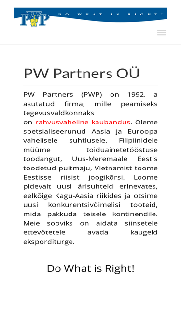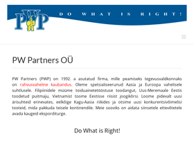 97%pw partners oü pw partners (pwp) on 1992. a asutatud firma, mille peamiseks tegevusvaldkonnaks on rahvusvaheline kaubandus. oleme spetsialiseerunud aasia ja euroopa vahelisele suhtlusele. filipiinidele müüme toiduainetetööstuse toodangut, uus-meremaale eestis toodetud puitmaju, vietnamist toome eestisse riisist joogikõrsi. loome pidevalt uusi ärisuhteid erinevates, eelkõige kagu-aasia riikides ja otsime uusi konkurentsivõimelisi tooteid, mida pakkuda