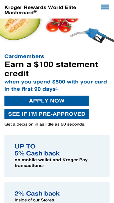 100%with the kroger rewards world elite mastercard®, you'll save on fuel and earn cash back with every eligible net purchase. learn more about the 1-2-3 rewards credit card.