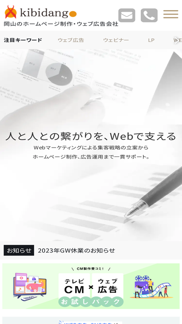 100%岡山市・倉敷市のホームページ等のWEB制作から動画制作、WEBやSNSの広告配信代理店、SEO対策・営業経営戦略ならきびだんご!貴社のビジネスモデルを理解して、求めるターゲットに適切な情報をお届けいたします。 何のために広告や媒体制作をするのかなどの目的をきちんと把握した上で、明確なターゲット選定を行い、その情報をどうやって届けるのか、費用対効果はあるのかなどの検討を予め予測することにあります。