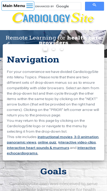 78%cardiologysite.com was conceived as a remote learning experience for health care providers, students, residents, fellows and people interested in expanding their knowledge in specific areas of cardiology. it was designed to provide the equivalent of classroom lectures and demonstrations with the use of the latest web-based multimedia technology. to facilitate this process, lessons were designed from the ground up instead of scanning in textbooks or videotaping a slide presentation and then modifying it for use on the internet. this site includes instructional movies, 3-d animation, panoramic views, online quiz, interactive video-clips, interactive heart sounds & murmurs and interactive echocardiograms.