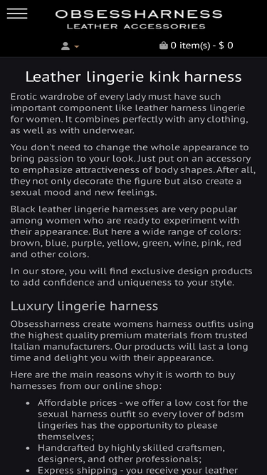 87%SET of: Leather body harness crotchless Chain Thigh cuffs - belt width 4 cm Handcuffs - belt width 4 cm 2 x leather double fixations Specification: Materials: genuine premium leather and metal fittings, made in Italy; Leather thickness is 3 mm Leather color - royal blue; Metal fittings color - gold. Leather Body Harness Crotchless is a handcrafted product made of high-quality Italian leather, designed to create erotic images in role-playing games, BDSM practices, and fetish parties. The product has a beautiful geometry of cutouts under the breast, leaving it open, as well as a cutout on the crotch that opens access to the pussy for intimate caresses and seduction. A cascade of symmetrical chains gives the look of brightness and elegance combined with the rawness of a femme fatale. Adjustable buckles on the panties allow you to choose a comfortable height and proper position, You can also find a comfortable fit on the body with the help of buckle straps on the back and along the shoulder blades. The set includes arm cuffs with double-sided clips for fastening to the side rings of the product or to the half rings of the garters, which will accelerate the flight of your erotic fantasy in the practice of gentle restriction of your partner. Garters are fastened to the side rings of the bodysuit with miniature carabiners on chains, adding “zest” to the image and new bondage experiments in BDSM positions. All elements of the сrotchless leather body harness are elegant, processed by special technology, and do not traumatize the skin, and do not leave scratches and injuries in places of contact with sensitive intimate areas. Give an impulse to your crazy sexual experiments.