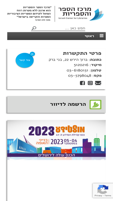 76%יצירת קשר גלריה נגישה יצירת קשר כתובת: ברוך הירש 22, בני ברקמיקוד: 5120216טלפון: 03-6180151פקס: 03-5798048 Envelope Instagram Square Facebook-square Whatsapp Tiktok הרשמה לדיוור לתרומה למרכז מפעלי ספרות literature & poetry קטלוג הספרים הישראלי The Catalogue Libby הספרייה הדיגיטלית Digital library מחלקת ההדרכה Instruction & Guidance Department מפגשים Shows & Lectures כנס השנתי Аnnual Conference חנות הספרים Book Boutique ספרות […]