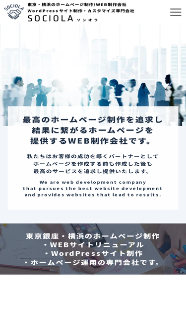 96%株式会社SOCIOLAは東京・横浜のホームページ制作、WEB制作、WordPressサイト制作専門会社です。コーポレートサイト・サービスサイト・採用サイト・通販サイトなどホームページの企画・制作・運用・WEBマーケティングのサービスを提供しています。最短の制作期間で高品質なホームページ制作を提供しております。