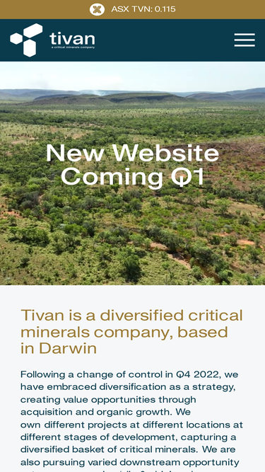 86%Tivan is building a company of strategic importance across northern Australia. Our portfolio spans a variety of projects across multiple locations anddevelopment stages, focused on critical minerals that are in structuralshort supply. Working closely with partners in Asia, we are activelycreating wealth by rapidly advancing projects, from acquisition anddiscovery to full production.At Tivan, we are dedicated to generating long-term value for ourshareholders while making a genuinely positive contribution to localcommunities. Tivan strongly supports the energy transition and thestrengthening of vital supply chains in Asia.