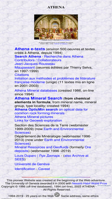 76%athena is a pioneer website created 1994 at geneva university. french literature e-texts. full mineral database with search programs