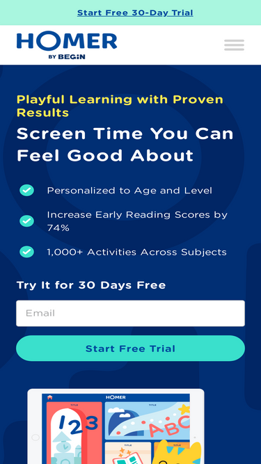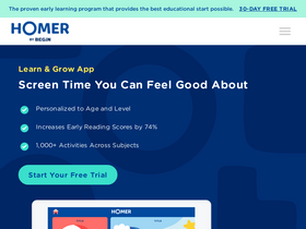 98%HOMER is the early learning program for ages 2-8 that is personalized to your child's interests to help them fall in love with learning. Try it free for 30 days!