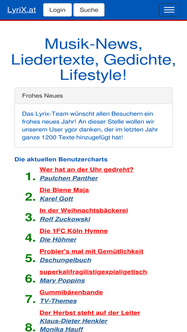 100%Englische und Deutsche Songtexte, Liedertexte, Lyrics von Schlagern, NDW, den aktuellen Charts, Rock, Pop, Rap, Evergreens bis zur Volksmusik, zahlreiche Übersetzungen und Songtexte mit Akkorden. Außerdem findet Ihr hier von Usern selbst geschriebene Gedichte, Witze und SMS-Sprüche.