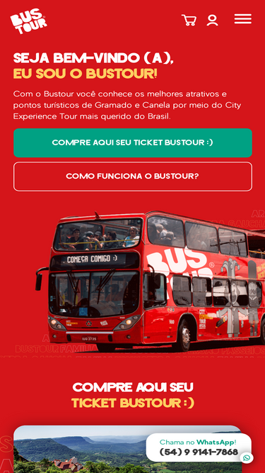 79%Inspirado pelas principais cidades turísticas do mundo, o Bustour é o transporte turístico oficial de Gramado e Canela. A bordo do Bustour você irá conhecer os melhores pontos turísticos e atrativos das duas cidades. Com o sistema hop on/hop off - você pode desembarcar nas paradas que deseja e retornar ao ônibus quantas vezes você desejar. Não é incrível? Dessa forma você monta seu roteiro com total liberdade, visitando somente os pontos que você desejar em um roteiro com mais de 40 atrações turísticas!