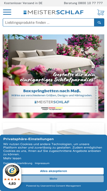 97%Meisterschlaf.de ist der Online-Fachhändler der AS Meisterstores GmbH mit Sitz in Lemgo, Deutschland. Unsere Mission Wir wollen erholsamen, gesunden Schlaf — durch hochwertige Betten, Boxspringbetten, Matratzen, Lattenroste, Topper und Bettwaren, die Komfort, Qualität und langlebige Verarbeitung vereinen. Unsere Leistungen & Vorteile 100-Nächte-Probeschlafen: Sie testen Ihr neues Bett in Ruhe zuhause — risikofrei. Kostenlose Lieferung und Rücksendung innerhalb Deutschlands. Lieferung bis ins Schlafzimmer sowie flexible Zahlungsarten (u.a. Kauf auf Rechnung). Große Produktvielfalt: vom klassischen Bettgestell über Boxspring-Modelle bis hin zu individuellen Sondergrößen und Konfigurationen. Kompetente Fachberatung per Telefon und E-Mail — damit Sie das passende Schlafsystem finden. Warum Meisterschlaf.de? Unsere Kunden loben vor allem die hohe Produktqualität, den komfortablen Schlafkomfort und den zuverlässigen, freundlichen Kundenservice. Viele schätzen auch die Möglichkeit, maßgeschneiderte Betten und Sondergrößen bestellen zu können — ideal für individuelle Wohnverhältnisse.