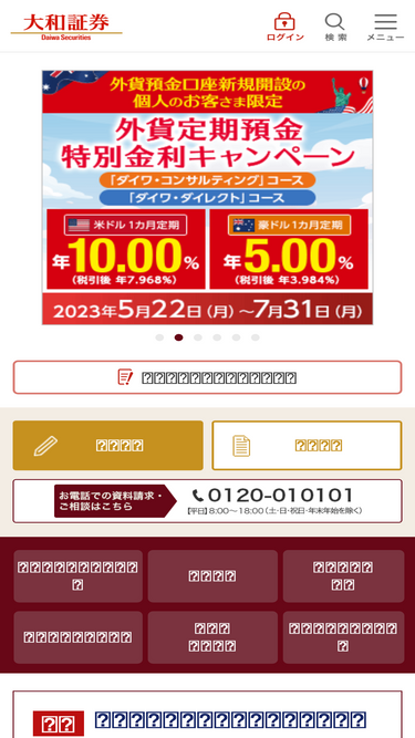 80%コンサルティングとネット取引の大和証券。全国のお店とコンタクトセンターで充実のサポート。株式、投資信託、債券、ファンドラップ、預金、年金・保険、FXなど総合証券会社ならではの豊富な商品を取り揃えています。