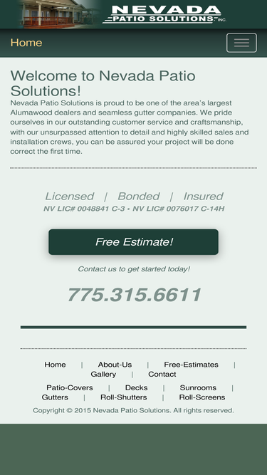 78%nevada patio solutions offers alumawood patio shade covers, custom decks, sunrooms, roll shades (both solar and shutters), and of course, seamless rain gutters.