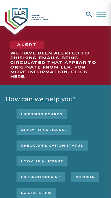 62%sc llr is making south carolina a safe place to work and live. the mission of the department of labor, licensing and regulation (llr) is to promote the health, safety and economic well-being of the public through regulation, licensing, enforcement, training and education.