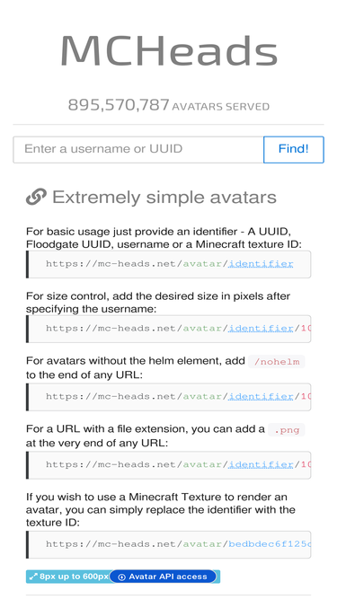 97%mcheads is an api that serves minecraft avatars for websites, forums and other projects as fast as possible, as simple as possible, for free!