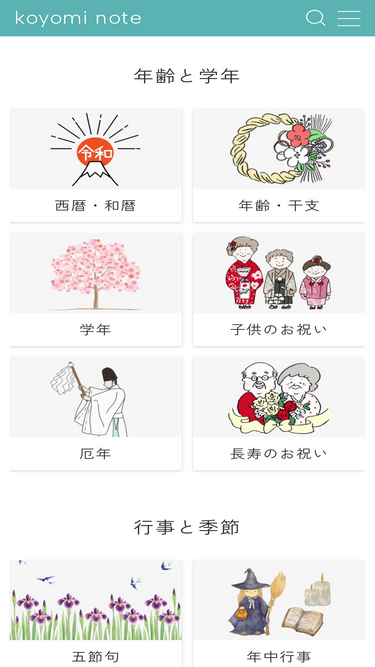 68%行事や季節のカレンダー、年齢や干支の早見表など、暦のあれこれを紹介しています。