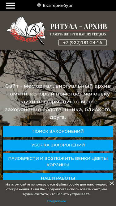 79%на нашем сайте вы можете воспользоваться поиском захоронений на кладбищах екатеринбурга, свердловской области и казани. заказать уборку могилы, возложение венков или заказать паспорт захоронения"