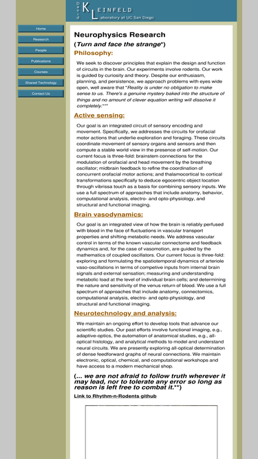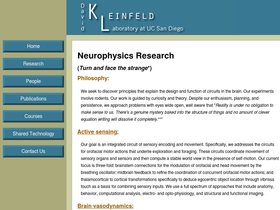 95%the david kleinfeld laboratory at uc san diego investigates how the vibrissa sensorimotor system of rodents extracts a stable world view through its actively moving sensors, the nature of binding orofacial actions into behavior, the biophysics of blood flow and patternd neurovascualr dynamics the level of single vessels in the brain, aspects of brain vasculature dysfunction, the nature of dopaminergic neuromodulatory dynamics in cortex, and new technologies for neuroscience.