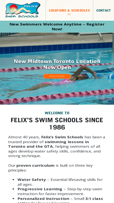 44%Expert-led private swim lessons across Toronto. Small class sizes, certified instructors, and 8 convenient locations at Felix’s Swim Schools.