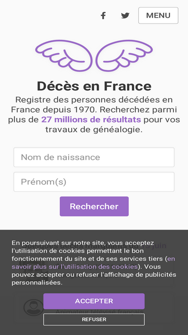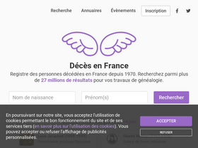 83%Registre des personnes décédées en France depuis 1970. Moteur de recherche pour la généalogie dans la base de données Insee de plus de 28 millions de résultats.