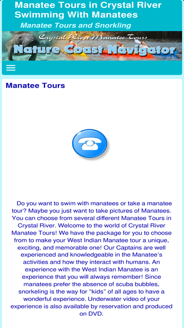 enjoy a manatee tour or swimming with the manatees in crystal river florida today. crystal river manatees are gentle and passive. choose from several different manatee tours, swimming with manatees, snorkeling with manatees, taking pictures of manatees or an underwater movie of you. call to reserve a manatee tour today toll free 866-337-7424.