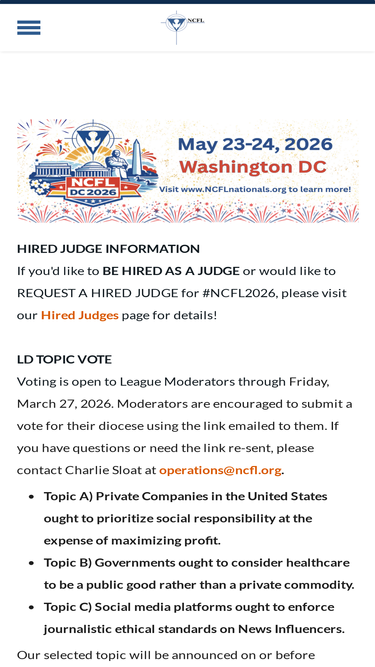 100% Overview About Us Officers Membership N ational Catholic Forensic League Tournament Info Calendar & Results Registration & Judge Information 2025-2026 Judge Training Session Events...