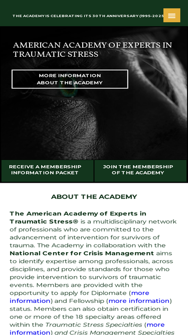 74%The American Academy of Experts in Traumatic Stress® is a multidisciplinary network of professionals who are committed to the advancement of intervention for survivors of trauma. The Academy in collaboration with the National Center for Crisis Management aims to identify expertise among professionals, across disciplines, and provide standards for those who provide intervention to survivors of traumatic events.
