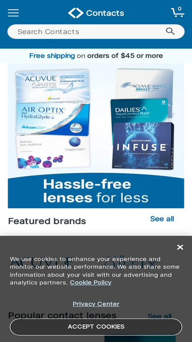 100%Order your contacts today and get them tomorrow — with free shipping! We carry all top brands like Acuvue Oasys, Air Optix, BioTrue, Biofinity, Alcon Dailies, Cooper Vision, ProClear and others.