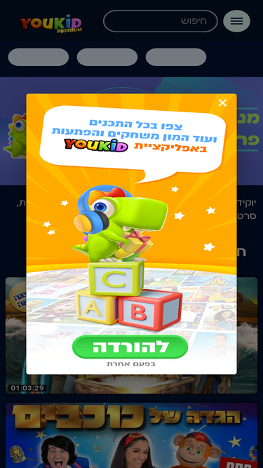 65%עכשיו ביוקיד, צפיה ישירה: שירו שיר - כוכבי הילדים, ג'מבו מותק - חנוכה 2024, המסע אל הכוכב - ההצגה, הכבש הששה עשר, טיף וטף 2 ועוד