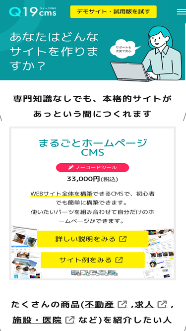 100%クイックCMSの「まるごとホームページCMS」を使ってサイトをノーコードで簡単構築。無料で試せる試用版も公開中。