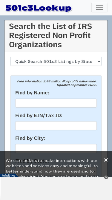 92%501(c)3 lookup tools. complete, searchable list of irs registered 501c, non profit organizations and charities