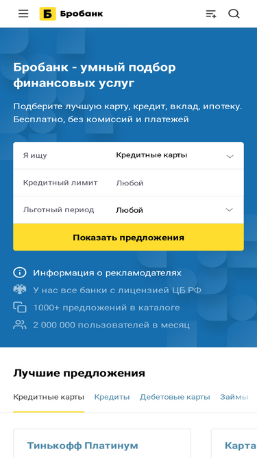 97%Бробанк (Brobank.ru) — сервис подбора займов, карт, кредитов, вкладов, ипотеки. Найдите и сравните условия, оформите онлайн на сайте банка.