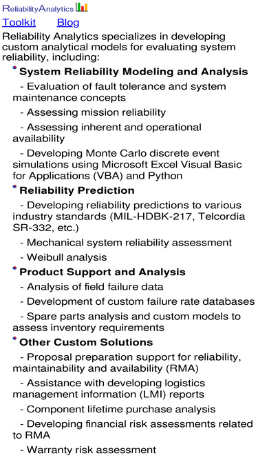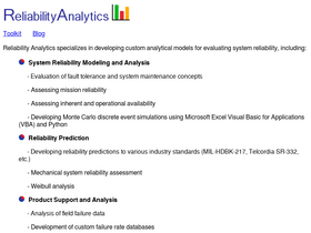 19%reliability analytics reliability engineering consulting services related to reliability, maintainability and availability analysis, including development of custom solutions for system reliability modeling, spare parts analysis, reliability prediction, and field failure data analysis. proposal preparation support for system reliability, maintainability and availability (rma).