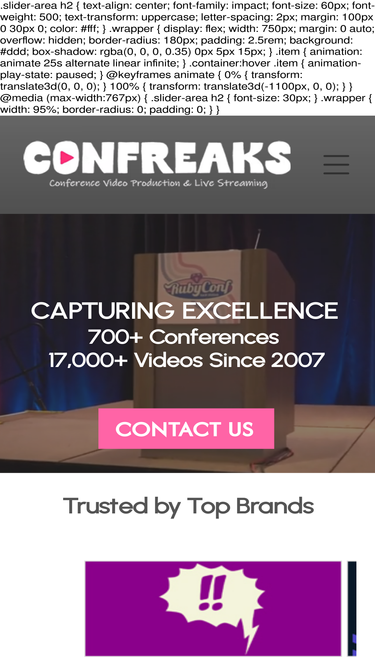 82%Confreaks is the top choice for conference video production and live streaming services. Our team excels at capturing the essence of events and delivering high-quality content to engage and inspire audiences worldwide. Trust Confreaks to bring your conference to life with professional video production and seamless live streaming capabilities.