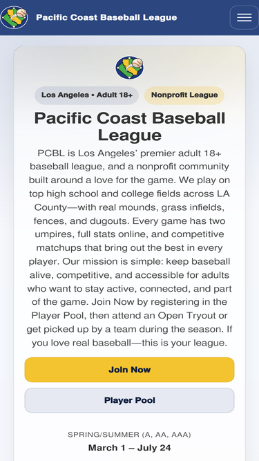 100%pcbl is the la and oc premiere adult 18+ baseball league of southern california. choose a league and join today to play some real baseball!