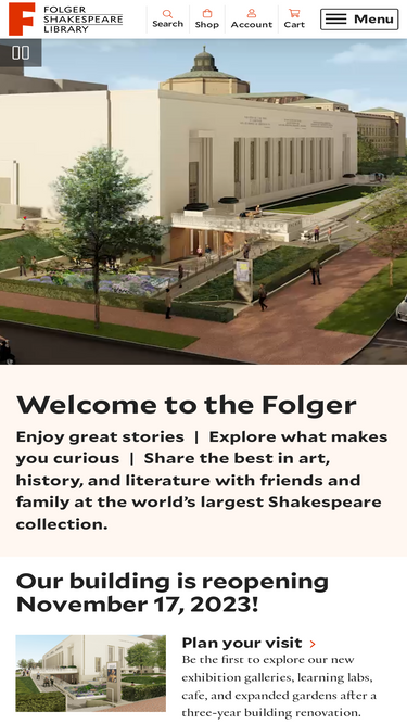 Folger Shakespeare Library is the world's largest Shakespeare collection, the ultimate resource for exploring Shakespeare and his world. Shakespeare belongs to you. His world is vast. Come explore. Join us online, on the road, or in Washington, DC.