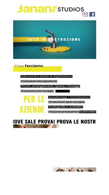 100%sito ufficiale del banana studios, dal 1996 punto di riferimento dei musicisti milanesi in zona bovisa politecnico, dotato di uno studio di registrazione e 4 sale prova. fornisce inoltre servizi di speakeraggio multilingua, sonorizzazione e video ripresa per la realizzazione di prodotti audiovisivi.