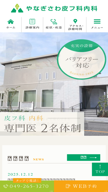 55%埼玉県川越市の皮膚科・内科「やなぎさわ皮フ科内科」では、2名の専門医が診療を行います。ほくろ・皮膚腫瘍・粉瘤などの摘除や、リウマチ・膠原病を専門分野とした高度な治療を提供します。皮膚や体の不調など一般的な症状もご相談下さい。女医も在籍しておりますので安心してお越しください。