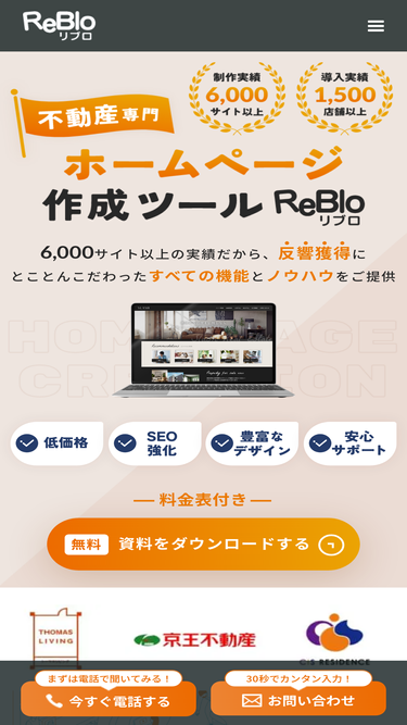 94%集客ができる不動産専門のホームページ作成サービス「リブロ」は、SEO施策済の居住用賃貸・売買・事業用賃貸・リフォーム専門サイトを短期間で制作・納品できる新サービス。低価格で高機能なリブロなら「こんなサイトが作りたかった」を実現。アドマスターや不動3之助、キマルーム、21CLOUD、AOSなど各種管理サービスとの物件連動も可能。