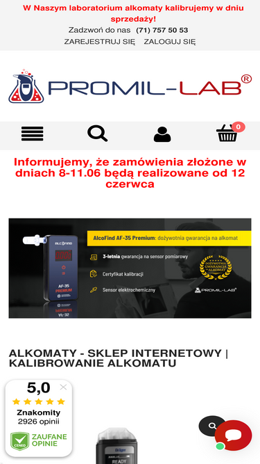 35%ALKOMAT OSOBISTY 3820 DRÄGER 2 LATA GWARANCJI + OKRESOWE KALIBRACJE GRATIS + GADŻETY Skalibrowany i gotowy do użycia alkomat, na tą okoliczność wystawiamy w dniu sprzedaży Certyfikat Adiustacji (kalibracji) urządzenia. Dräger 3820 to kolejne specjalistyczne urządzenie niemieckiego producenta – tym razem jednak do zastosowań indywidualnych. Niezwykle precyzyjny, niezawodny, a przy okazji również elegancki model wyposażony został w policyjny sensor elektrochemiczny (zaawansowany technologicznie 1/4" DrägerSensor), a także intuicyjne, polskie menu. Sprzęt przypadnie do gustu osobom poszukującym wysokiej jakości, pewnych oraz sprawdzonych rozwiązań. Profesjonalna „perełka” od Dräger to gwarancja dokładności i powtarzalności pomiarów. Rozwiązania marki Dräger są bezkonkurencyjne, jeśli chodzi o szybkość i niezawodność pomiaru. Dopracowane w każdym szczególe alkomaty wiodą prym zarówno w zakresie samokontroli jak i badań przeprowadzanych na potrzeby firm, przedsiębiorstw oraz instytucji. Model 3820 to propozycja dedykowana wszystkim tym, dla których jakość jest najważniejsza. Dlaczego warto wybrać Dräger 3820? Dräger 3820 to urządzenie charakteryzujące się maksymalną wydajnością. Dbałość o każdy, nawet najmniejszy szczegół przekłada się na jego niezawodność oraz powtarzalność pomiarów. Wyprodukowany w Niemczech cieszy się niesłabnącą popularnością w całej Europie. Proste, intuicyjne menu, komfort oraz wygoda użytkowania oraz szereg funkcji dodatkowych sprawiają, że Dräger to dobry wybór zarówno dla początkujących jak i nieco bardziej obeznanych z tematyką alkomatów. Urządzenie gotowe jest do pracy już po kilku sekundach. Wszystkie funkcje pomiarowe obsługiwane są przez jeden przycisk. Specyfikacja techniczna: Model: Dräger 3820 Sensor: sensor elektrochemiczny 1/4" DrägerSensor Zakres pomiaru: 0,00-5,00‰ Rozdzielczość wskazań: 0,01‰ do 2 miejsc po przecinku Temperatura pracy: od -5°C do +50°C Wyświetlacz: wysokiej rozdzielczości wyświetlacz LCD Kolor: czarny Gotowoś