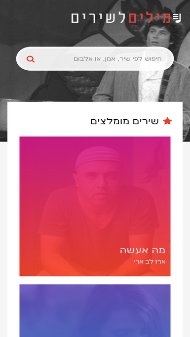 79%מילים לשירים ישראלים בעברית בליווי וידאו קליפים. באתר תוכלו לחפש מילים לשירים לפי שם השיר, האמן או האלבום.