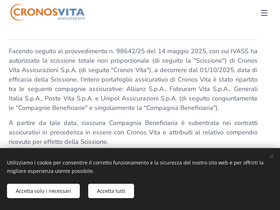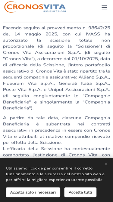 99%Facendo seguito al provvedimento n. 98642/25 del 14 maggio 2025, con cui IVASS ha autorizzato la scissione totale non proporzionale (di seguito la "Scissione") di Cronos Vita Assicurazioni S.p.A. (di seguito "Cronos Vita"), a decorrere dal 01/10/2025, data di efficacia della Scissione, l'intero portafoglio assicurativo di Cronos Vita è stato...