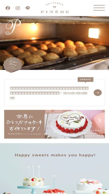 100%ケーキ店 PINEDE(ピネード)のオフィシャルサイトです。オリジナルメッセージやイラストが描けるチーズケーキや、色々な記念日をさらに楽しく盛り上げるデコレーションケーキなど、お客さまのストーリーに寄り添ってお菓子をお作りしています。ケーキや焼き菓子を通して、沢山のハッピーをお届けしていきます。