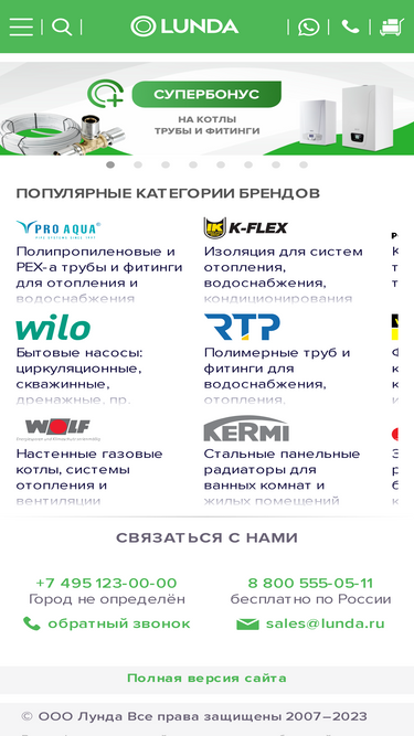 94%Запорная арматура, насосы, котлы и различного назначения, отопительные приборы, автоматика для котлов, теплых полов и многое другое для инженерной сантехники в наличие на складе в Москве. Экспресс-доставка на объект собственным автопарком, через ТК в любой город России, гибкие условия монтажникам, грамотный подбор и комплектация объектов. LUNDA - надежный и проверенный поставщик инженерной сантехники.