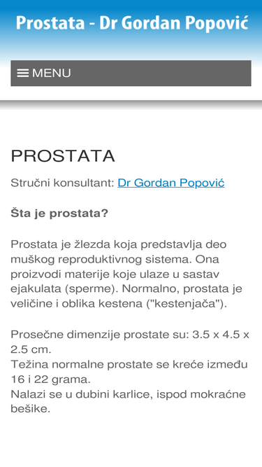 84%prostata je žlezda koja predstavlja deo muškog reproduktivnog sistema. ona proizvodi materije koje ulaze u sastav ejakulata (sperme). normalno, prostata je veličine i oblika kestena