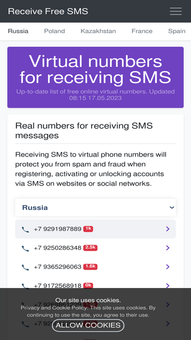 85%receiving messages, confirmations and activations via sms to temporary and one-time virtual numbers. without registering. current phone numbers from the usa, canada, great britain, russia, ukraine, finland, spain and 24 more countries.