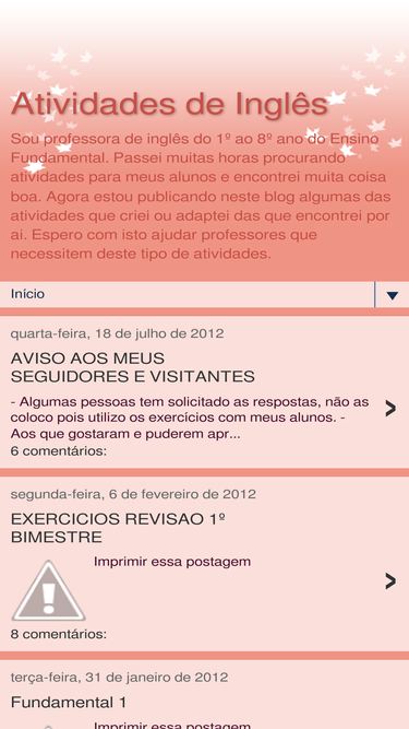 sou professora de inglês do 1º ao 8º ano do ensino fundamental. passei muitas horas procurando atividades para meus alunos e encontrei muita coisa boa. agora estou publicando neste blog algumas das atividades que criei ou adaptei das que encontrei por ai. espero com isto ajudar professores que necessitem deste tipo de atividades.